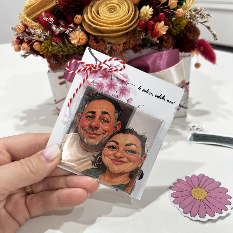 Transformăm poza într-o caricatură veselă 😊, imprimată pe suport magnetic, în format 6,35 × 6,35 cm, perfect de oferit de 1 sau 8 Martie 🌸