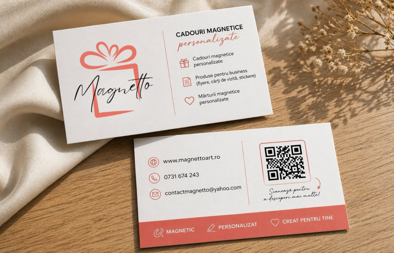 Realizate pe hârtie foto premium de 300g 📄, cărțile de vizită Magnetto se remarcă prin culori vibrante și finisaje de calitate, menite să atragă atenția și să transmită profesionalism 💼