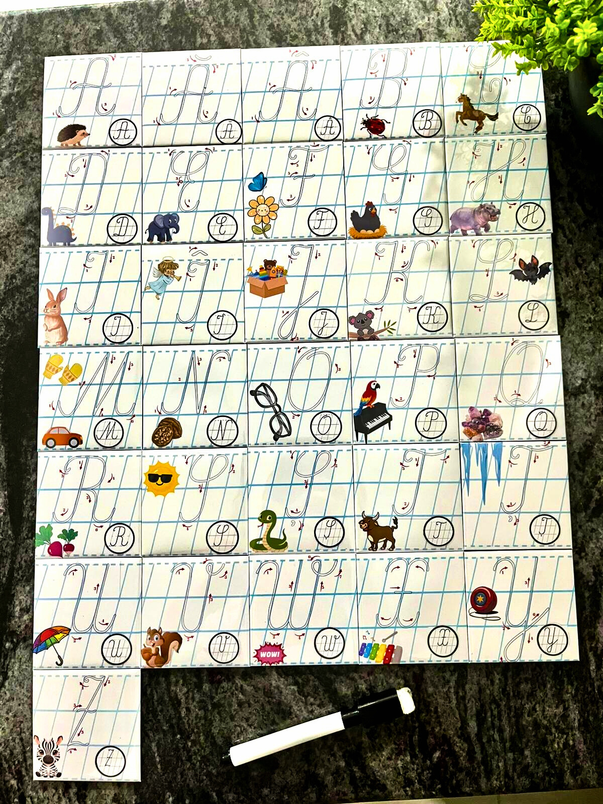 Învățarea scrisului de mână devine mai ușoară și mai plăcută 🎉 Setul de magneți educativi cu alfabet de mână este creat special pentru copiii care încep să exerseze scrierea cursivă, pas cu pas. Fiecare magnet conține o literă de mână cu contur punctat și săgeți de ghidaj, ajutând copilul să învețe ordinea corectă a mișcărilor ✏️➡️. Fundalul tip caiet și ilustrațiile simpatice 🐶🌸 facilitează asocierea și mențin interesul celor mici 👀🧠.